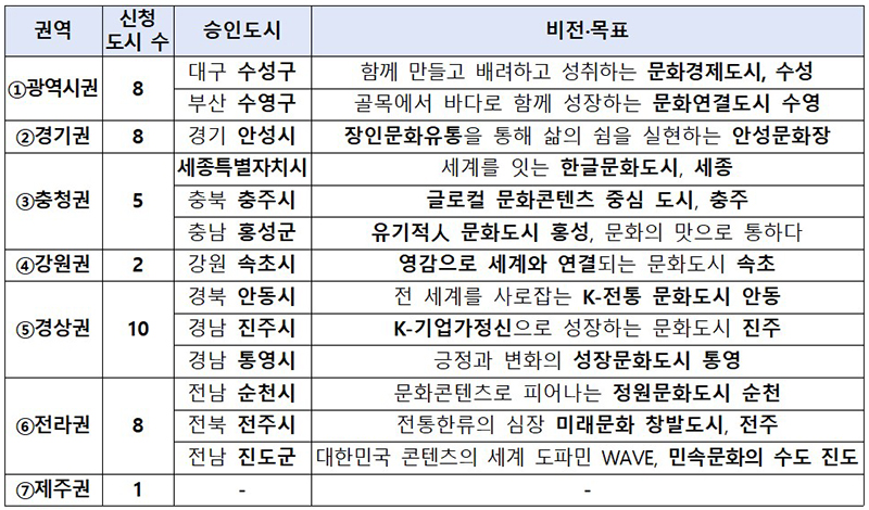 이에 조성계획을 승인받은 지자체는 1년간 예비사업을 추진하고, 문체부는 문화도시심의위원회의 예비사업 추진실적 심사를 거쳐 내년 말에 최종적으로 ‘대한민국 문화도시’를 지정할 계획이다.