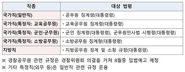 일반직, 지방직, 교육, 군인·군무원, 소방공무원에 적용되는 이번 개정안에서는 징계의결 시 참작사유에 혐의자의 ‘직급’과 ‘비위행위가 공직 내외에 미치는 영향’을 추가하고, 비위와 관련이 없는 ‘근무성적’을 삭제했다.