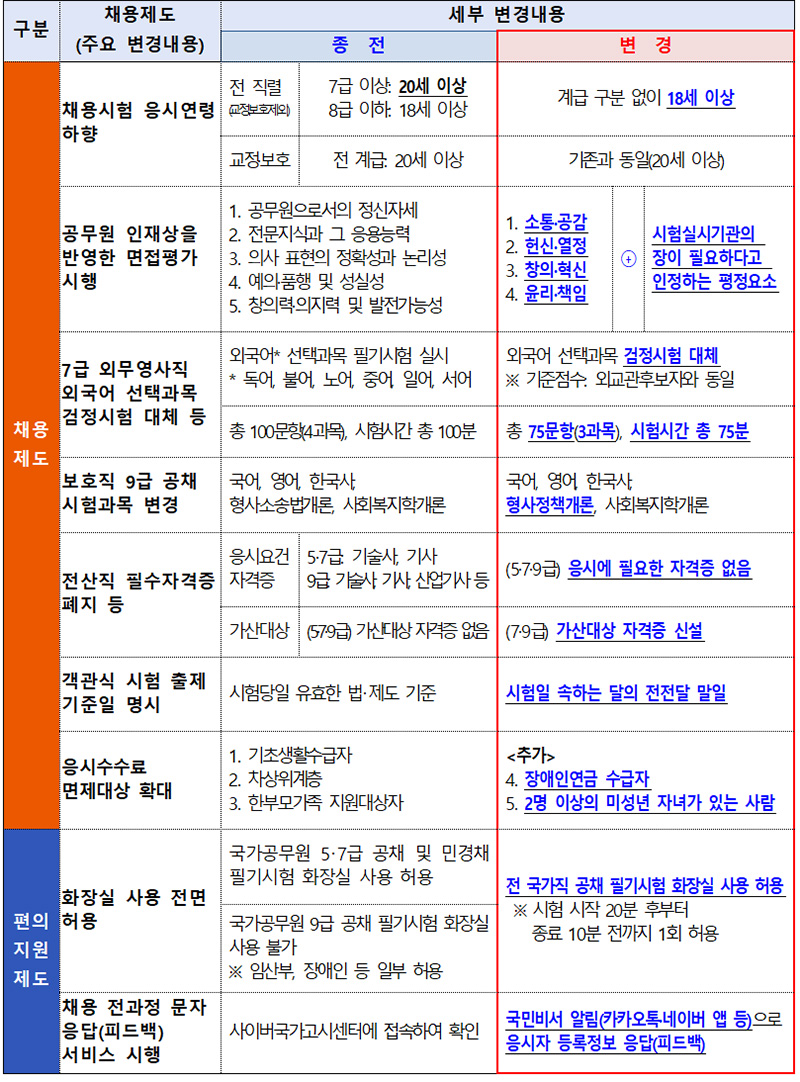 우선, 5·7급 국가공무원 채용시험에 응시할 수 있는 연령 기준이 20세 이상에서 18세 이상으로 낮아진다.