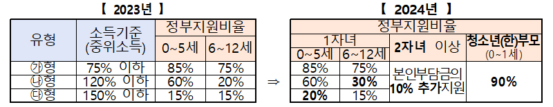 여가부는 아이돌봄서비스를 이용하는 가구에 소득수준별로 차등해 지원했으나 올해부터는 지원 확대에 따라 2자녀 이상 가구에 본인부담금의 10%를 추가 지원한다.