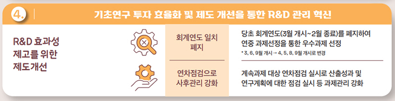 먼저 기초연구사업의 ‘회계연도 일치’(3월 개시~2월 종료) 제도를 폐지해 연중 과제 선정을 통한 유연함으로 우수한 과제를 선정한다.