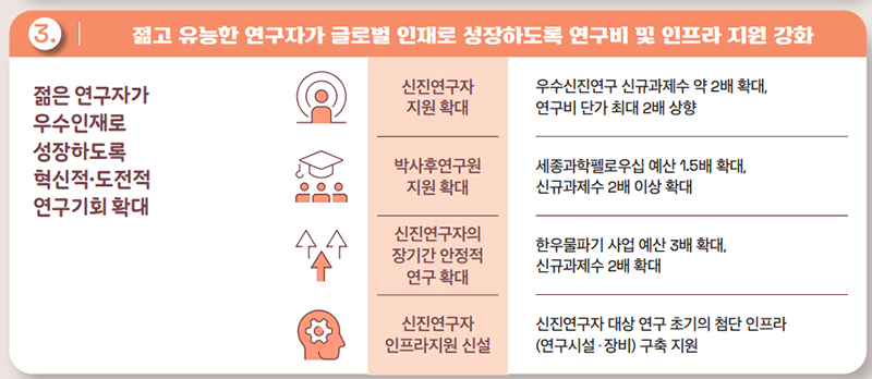 또한 박사후연구원 및 비전임 교원이 도전적인 연구를 수행하고 역량 있는 연구자로 성장할 수 있도록 세종과학펠로우십 지원을 신규과제 수는 200개에서 500개로, 관련 예산은 869억 원에서 1299억 원으로 확대하는 등 전년대비 2배 이상 확대했다.
