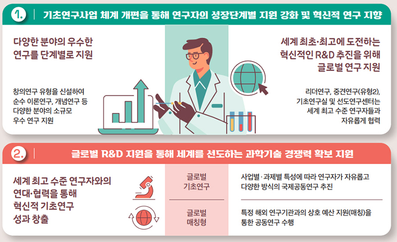 과기정통부는 세계 최초·최고에 도전하는 혁신적인 R&D로 전환을 위해 기초연구사업 지원 체계를 일부 개편했다.