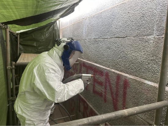 또한, 이번 작업(1단계)은 동절기와 담장 위치별 석재의 상태를 고려하여 스프레이 오염물질을 제거하기 위한 응급복구 위주로 추진하였으며, 담장의 표면 상태에 대한 모니터링을 거친 후 보존처리 작업(2단계)을 최종 완료할 예정이다. 지금 시점의 공정률은 80% 정도로 예상한다.