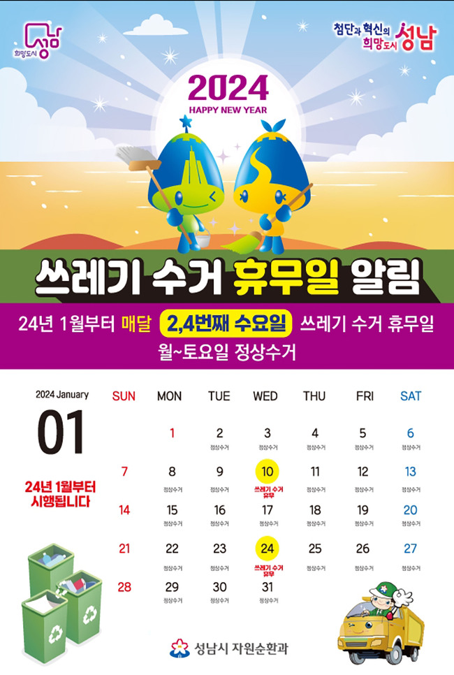 이달 10 일부터 수요일 휴무제가 시행돼 1 월 24 일 , 2 월 7 일 , 2 월 21 일 등 해당 날짜에는 쓰레기를 수거하지 않는다 .