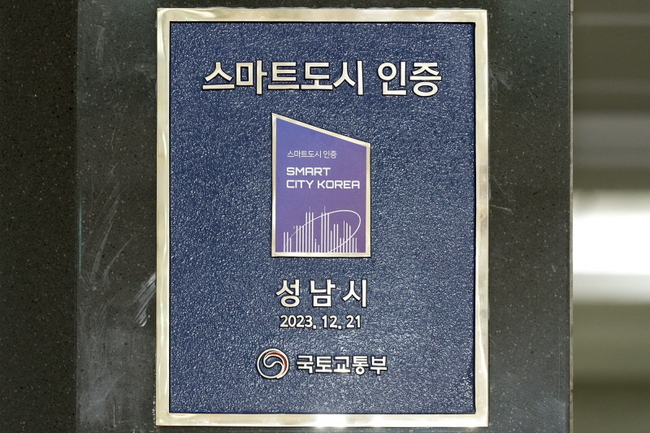 성남시 는 국토교통부가 주관하는 ‘2023 년 스마트도시 인증 ’ 공모에서 스마트도시 국내 인증을 획득해 4 일 오전 10 시 시청 로비에서 현판식을 개최했다 .