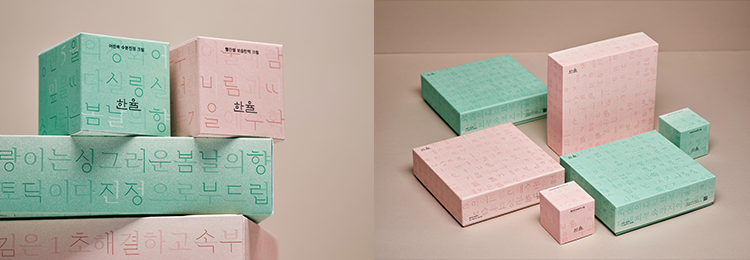 한율의 대표 원료인 '어린쑥'과 '빨간쌀'이 쌓아온 비법과 효능, 피부에 주는 이로움에 대한 내용을 단상자에 한글로 꽉 채워 담았으며, 한글의 특징이 살아나는 패턴으로 디자인해 다가오는 설 선물용으로도 적합하다.