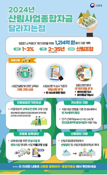 2024년 융자 규모는 전문임업인기반조성 788억 원, 귀산촌인 창업 및 주택구입 180억 원, 단기산림소득지원 101억 원 등이며, 산림사업을 하고자 하는 임업인 및 생산자 단체 등에 지원한다.