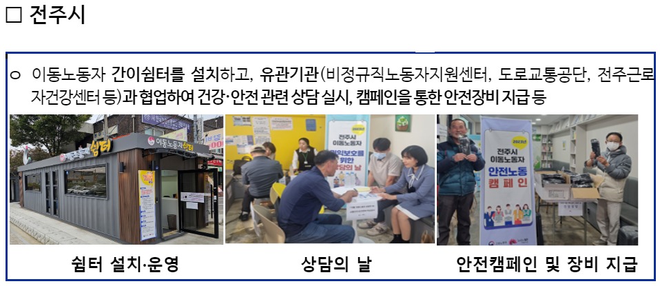 2023년에는 15개 자치단체와 9개 기업을 지원하여 종사자 94,388명이 이동 과정에서 쉼터를 이용하거나 안전·건강관리·고객응대요령을 교육받는 등 혜택을 받았다.