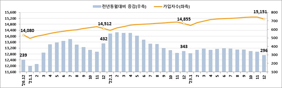 2023년 12월말 기준 고용보험 상시가입자는 1,515만 1천명으로 전년동월대비 29만 6천명(+2.0%) 증가하였다.