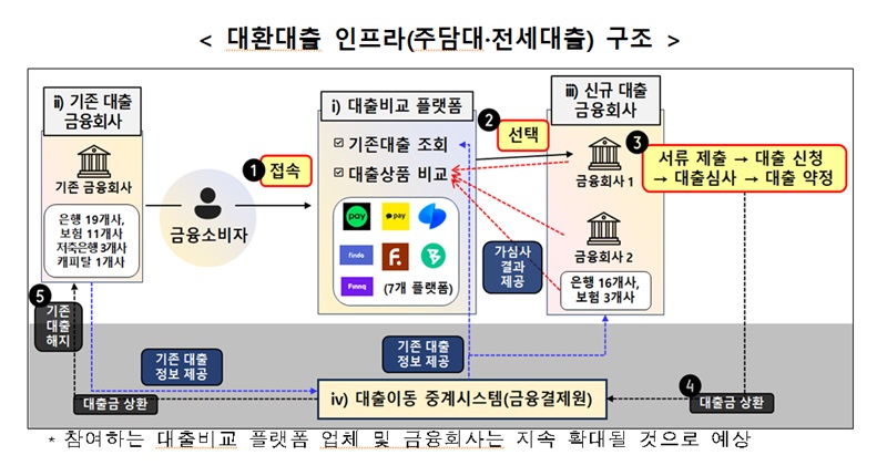 대환대출 인프라는 기존 대출·갈아탈 대출을 조회하는 대출비교 플랫폼을 비롯해 기존 대출을 보유한 금융사, 갈아탈 신규 대출 상품을 제공하는 금융사, 금융결제원의 대출이동 중계시스템 등으로 구성된다.