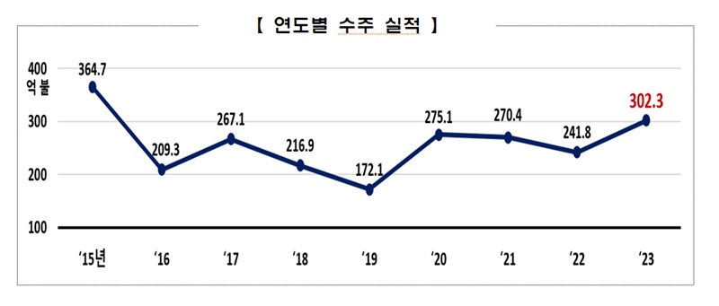 이는 지난 2022년 241억 8000만 달러와 비교해 25% 증가한 것으로, 2015년 이후 8년만의 최대 성과다.