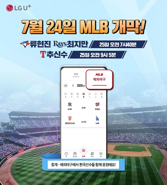 LG유플러스는 프로야구 전용 앱 'U+프로야구'에서 류현진(33·토론토 블루제이스)이 선발 투수로 나서는 탬파베이 레이스와의 25일(토) 오전 7시 40분(이하 한국시간) 개막전 경기를 시작으로 미국 메이저리그(MLB) 경기를 실시간 생중계한다고 밝혔다.