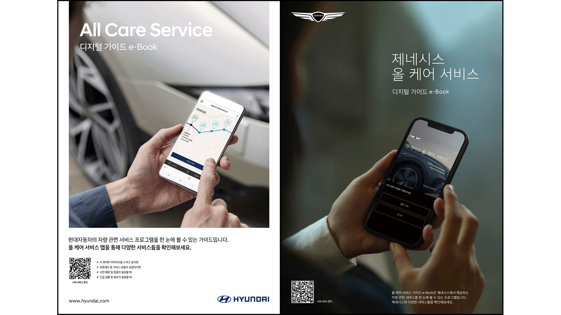 ‘올 케어 서비스 가이드 e-Book’은 오늘부터 현대자동차/제네시스 공식 홈페이지 및 차량 카탈로그에 삽입된 QR코드를 통해 누구나 열람할 수 있다.