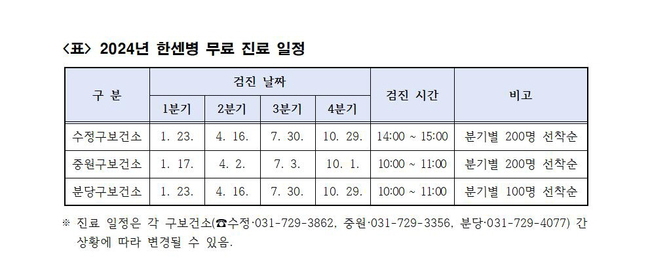 장소별 검진 일정은 ▲ 수정구보건소 =1 월 23 일 , 4 월 16 일 , 7 월 30 일 , 10 월 29 일 오후 2 시 ▲ 중원구보건소 =1 월 17 일 , 4 월 2 일 , 7 월 3 일 , 10 월 1 일 오전 10 시 ▲ 분당구보건소 =1 월 23 일 , 4 월 16 일 , 7 월 30 일 , 10 월 29 일 오전 10 시다 .