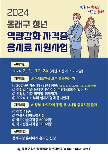 부산 동래구는 오는 2월 1일부터 관내 미취업 청년들의 취업 능력 개발을 지원하는 '2024 동래구 청년 역량강화 자격증 응시료 지원사업'을 추진한다고 밝혔다.