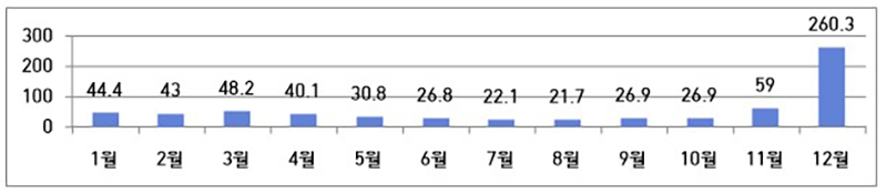 분기별 기부금 모금 규모는 1분기 135억 6000만 원, 2분기 97억 7000만 원, 3분기 70억 7000만 원, 4분기 346억 2000만 원이었으며 특히 12월 모금액은 260억 3000만 원인 것으로 나타나 연말 기부 집중 현상이 뚜렷했다.