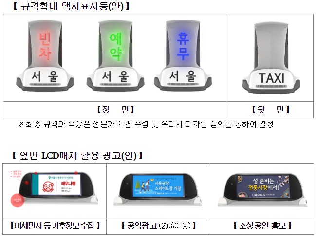 넷째, 택시업계가 부가적인 광고수입을 얻고 빈 택시의 시인성을 높이기 위해 ‘규격확대 택시표시등’을 새롭게 도입한다. 옆면의 LCD 화면에 광고를 실어 대당 월 10만 원의 광고수익을 얻을 수 있을 것으로 기대된다. 8월 중 200대에 시범 운영하고, 설치차량을 확대해나간다.