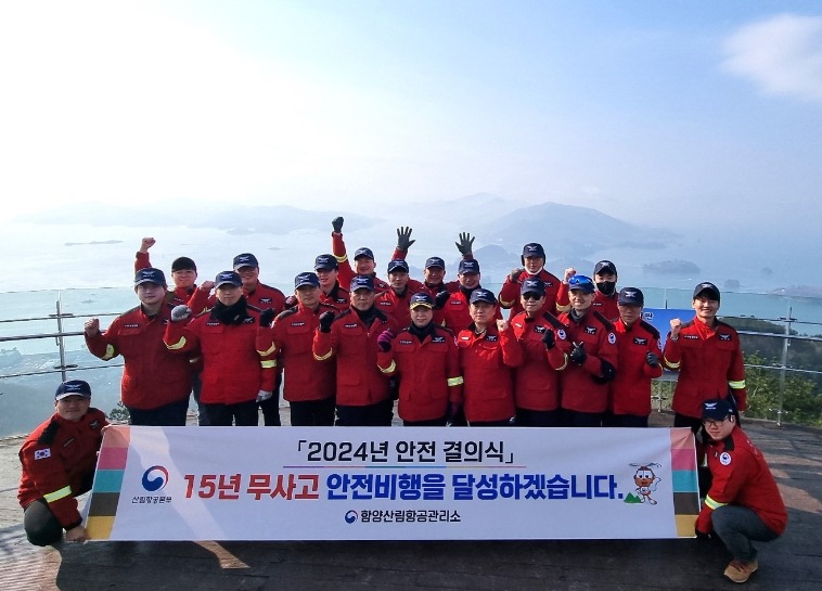 산림청 함양산림항공관리소는 전 직원이 참여한 가운데 2024년 갑진년 새해 사천 각산 전망대에서 무사고 안전비행을 다짐하는 항공안전 결의식을 가졌다.