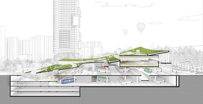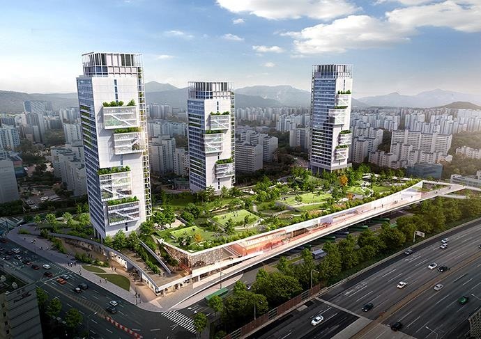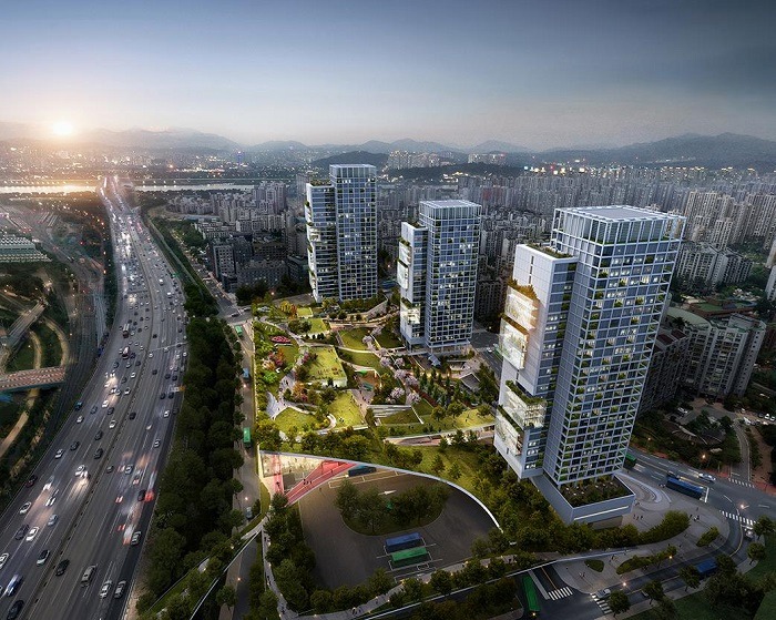 당선작은 총 35,804㎡ 부지에 인근 주거지(동측)에서 도시고속도로(서측) 방향으로 상승하는 모양의 ‘경사형 도시숲’을 조성하고, 도시숲을 중심으로 지하와 지상으로 다양한 시설을 입체적으로 배치하는 컴팩트시티를 제안했다.