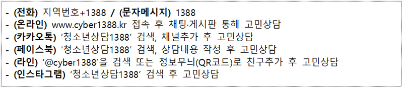 여가부는 “청소년상담1388의 전문상담 인력을 확충해 상담 대기시간을 단축하고 상담채널 시스템 통합을 추진하는 등 언제 어디서든 편리하게 도움을 받을 수 있도록 청소년상담1388의 기능을 더욱 강화하겠다”고 밝혔다.