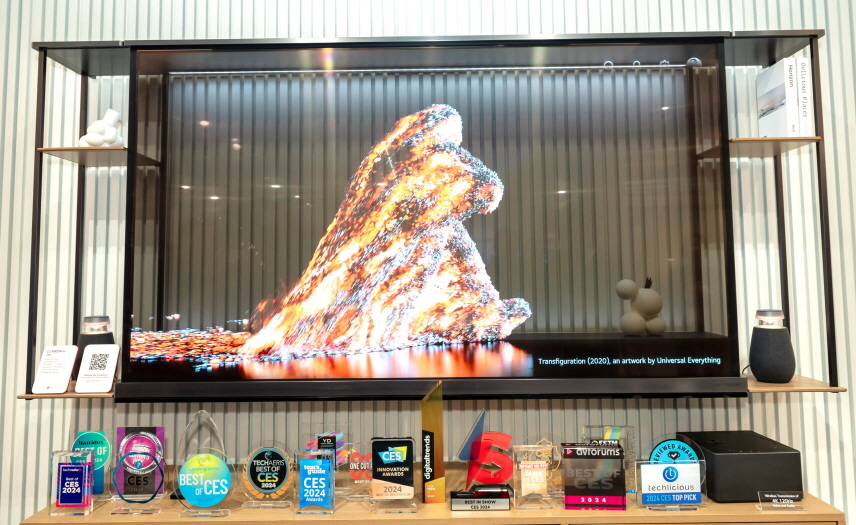 LG전자가 선보인 세계 최초의 무선 투명 올레드 TV ‘LG 시그니처 올레드 T’가 美 라스베이거스에서 열린 세계 최대 가전·IT 전시회 CES 2024의 최고 제품으로 선정됐다.