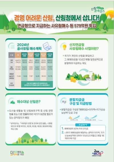 올해 사유림 매수 예산은 전년 대비 16억 원이 증액된 579억 원 규모로, 전체 매수 면적 중 3,705ha(478억원)에 대해서는 매매대금을 일시지급하고, 742ha(101억원)에 대해서는 매매대금을 10년간 분할하여 지급하는 산지연금형으로 나누어 추진한다.