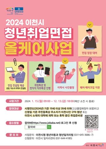 이천시는 오는 1월 15일부터 이천시 청년 구직자들을 대상으로 '청년취업면접 올케어 사업'을 개시한다고 밝혔다.