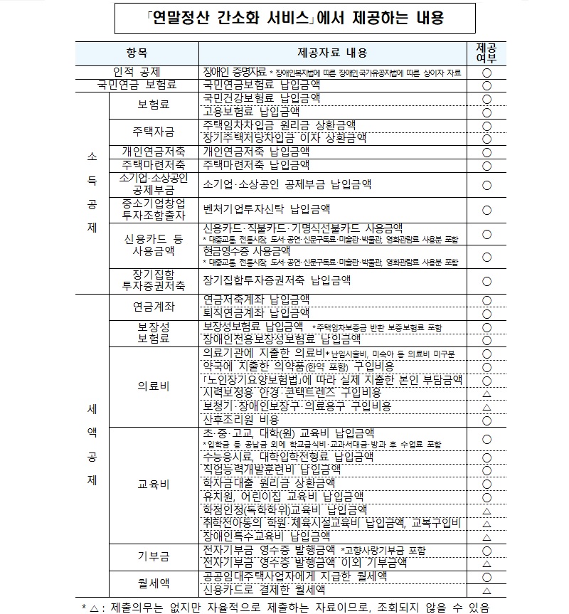 간소화 서비스는 올해 처음으로 제공하는 고향사랑기부금, 영화관람료, 고용보험료, 수능 응시료·대학 입학전형료를 포함해 모두 41가지 증명자료를 제공한다.
