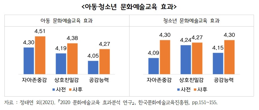 보고서에 따르면 모든 어린이‧청소년은 균등한 문화예술교육 기회를 제공받을 권리가 있으며, 어린이‧청소년 문화예술교육은 문화예술 향유 지속성과 자아존중감, 상호친밀감, 공감능력 등 개인적‧심리적 차원에 긍정적 효과가 있는 것으로 나타났다.
