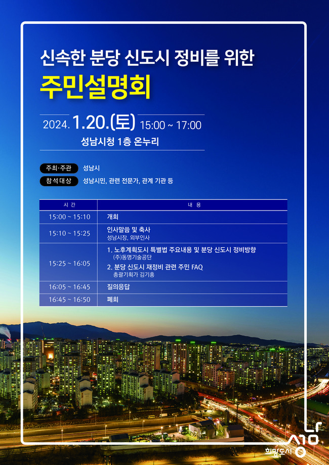 성남시는 오는 1 월 20 일 오후 3 시 시청 1 층 온누리에서 ‘ 신속한 분당신도시 정비를 위한 주민설명회 ’ 를 개최한다 .