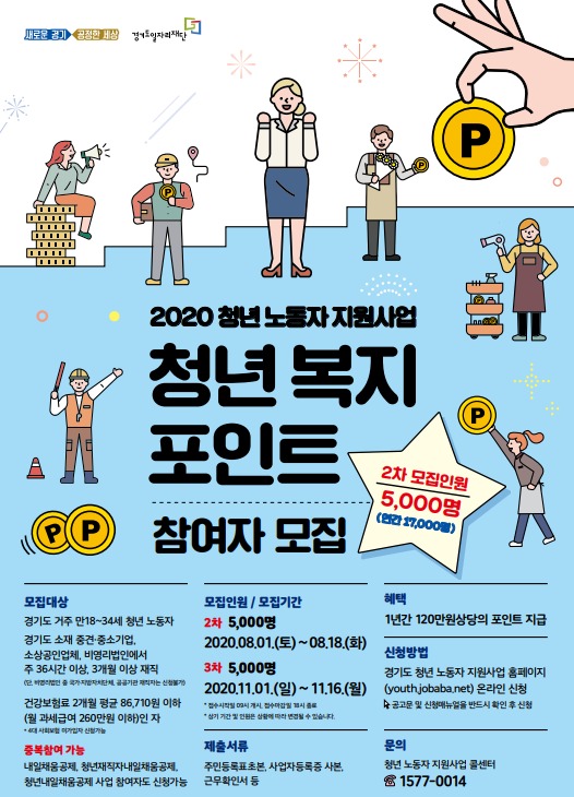 경기도가 청년 노동자들의 복리후생과 처우 개선을 위해 실시 중인 청년 노동자 지원사업의 하나인 ‘청년 복지포인트’ 2차 참여자 5천명을 공개 모집한다.
