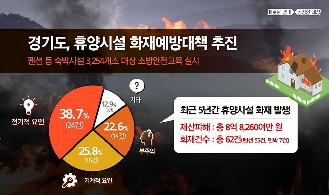 도 소방재난본부에 따르면 지난 2015년부터 2019년까지 최근 5년간 도내 휴양시설에서 총 62건(펜션 55건‧민박 7건)의 불이 나 연평균 12.4건이 발생한 것으로 집계됐다.