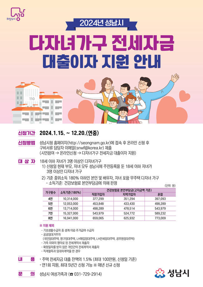 성남시는 다자녀가구의 전세금 대출이자 상환에 대한 부담을 줄여 아이 양육에 도움을 주려고 지난 2021 년 이 사업을 도입했다 .