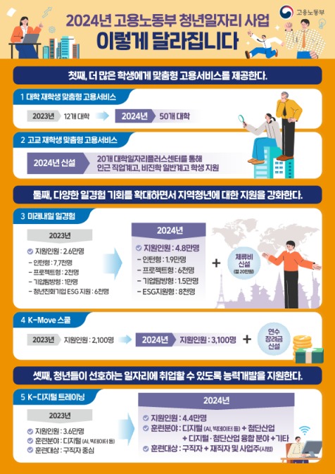 고용노동부는 2024년 청년일자리 사업을 통해 ‘재학-구직-취업’ 단계별 상황에 맞춰 청년들이 원하는 맞춤형 지원을 강화한다.
