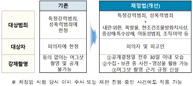 기존에는 특정강력범죄와 성폭력범죄의 피의자에 한정해 신상정보 공개가 가능하고 피의자의 동의 없이는 ‘머그샷’ 촬영이나 공개가 어려웠다.