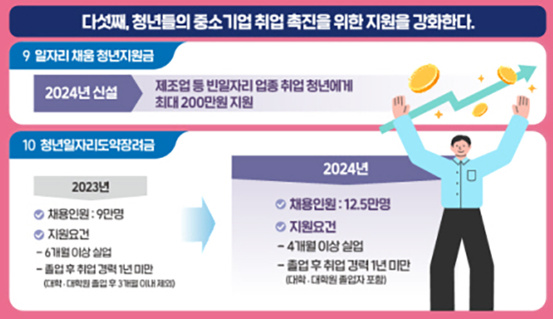 청년들의 중소기업 취업 촉진을 위한 지원을 강화하는데 제조업 등 빈일자리 업종 중소기업에 취업하는 청년은 3개월 차 100만 원, 6개월 차 100만 원 등 모두 200만 원을 지원받을 수 있다.