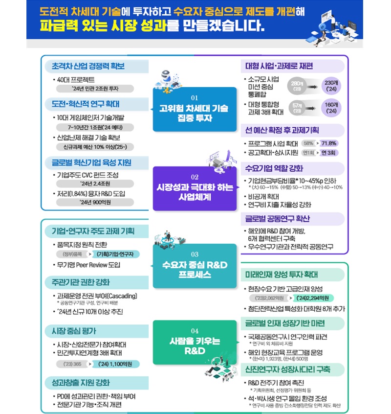 또한, R&D 프로세스를 수요자 중심으로 전환해 품목지정 방식을 전면 도입해 정부는 도전적 목표만 제시하고, 기업과 연구자가 과제기획을 주도한다.