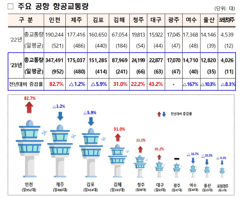 또한, 코로나19 종식에 따른 펜트업 효과로 인천공항(82.7%↑)뿐만 아니라 청주·김해·대구 등 지방 국제공항의 항공교통량이 각각 31%, 22%, 43%로 크게 증가했다.