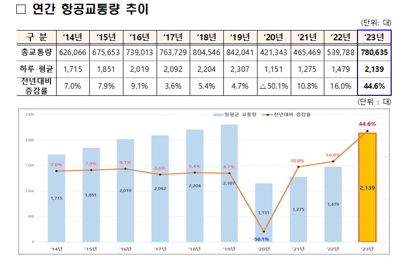 지난해 우리나라 하늘길을 이용한 항공기는 전년 대비 44.6% 증가한 78만여 대, 하루 평균 2139대인 것으로 나타났다.