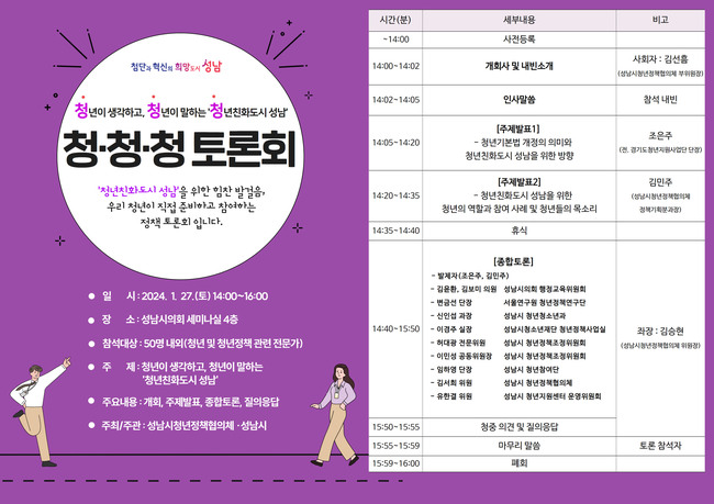 성남시는 오는 1 월 27 일 오후 2 시 시의회 4 층 세미나실에서 ‘ 청년이 생각하고 청년이 말하는 청년친화도시 성남 ’ 을 주제로 한 토론회 ( 청 · 청 · 청 토론회 ) 를 개최한다 .