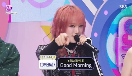 최예나는 21일 방송된 SBS 음악 프로그램 '인기가요'에 출연해 세 번째 미니 앨범 '굿모닝'(GOOD MORNING)의 동명의 타이틀곡 '굿모닝' 무대를 선보였다.
