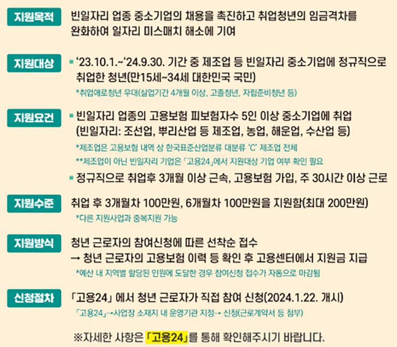 지원 대상은 만15~34세 청년 중 ▲제조업 중소기업(고용보험 피보험자 수 5인 이상 우선지원대상기업)에 ▲2023년 10월 1일 이후 정규직으로 취업(주 30시간 이상)해 ▲3개월 이상 근속한 근로자다.