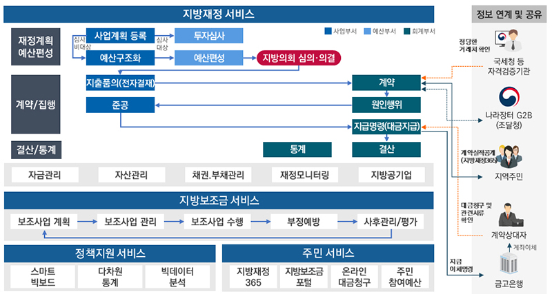 먼저 지방재정을 운용하는 ‘e호조+’는 국가재정(e나라도움), 교육재정(K-에듀파인), 사회복지시스템(행복e음), 전 지자체 금고 등과 연계해 예산집행, 계약 및 자금·자산·부채·세입세출외현금 관리 등의 기능을 제공한다.