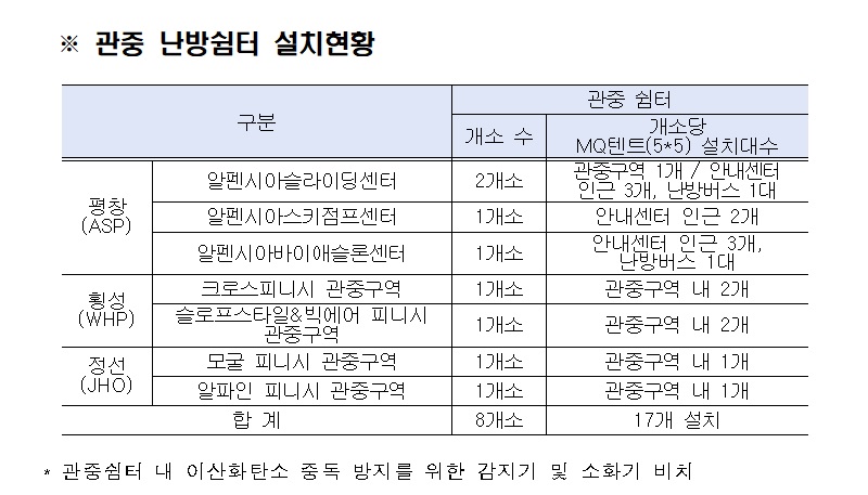 아울러, 조직위는 설상경기장마다 관중 난방쉼터(원적외선 난로, 의자 등)를 설치하고 임산부, 노약자 등을 위해 안내센터 내 휴식공간을 제공해 대회 경기 운영에 만전을 기하고 있다.