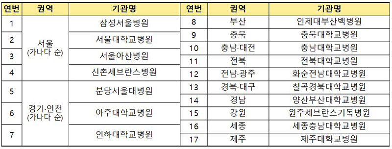 서울대병원·아주대병원·충남대병원·칠곡경북대병원·제주대병원 등