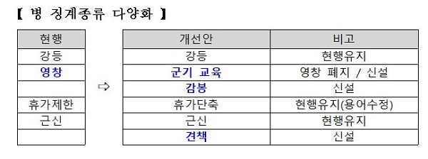 이번에 개정된 군인사법은 영창의 위헌성 논란을 해소하고 장병 인권보장을 위해 영창제도를 폐지하고 군기교육으로 대체하는 등 병 징계 종류를 강등, 군기교육, 감봉, 견책 등으로 다양화하는 내용을 담고 있다.