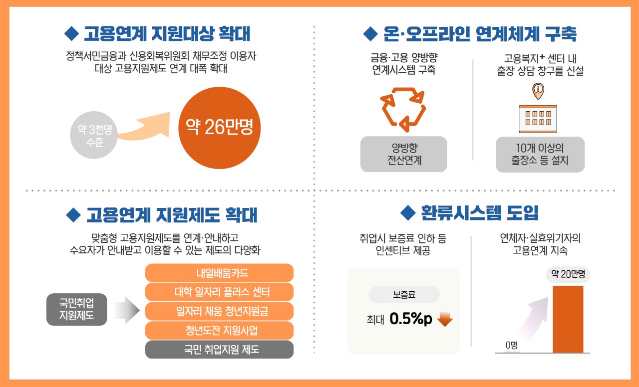 정책서민금융·채무조정을 이용하는 서민·취약계층에 대한 금융·고용 간 연계가 일회성이 아니라 지속적이고 체계적으로 이루어질 수 있도록, 금융지원제도와 고용지원제도 간 상호 연계를 강화하는 환류시스템을 마련한다.