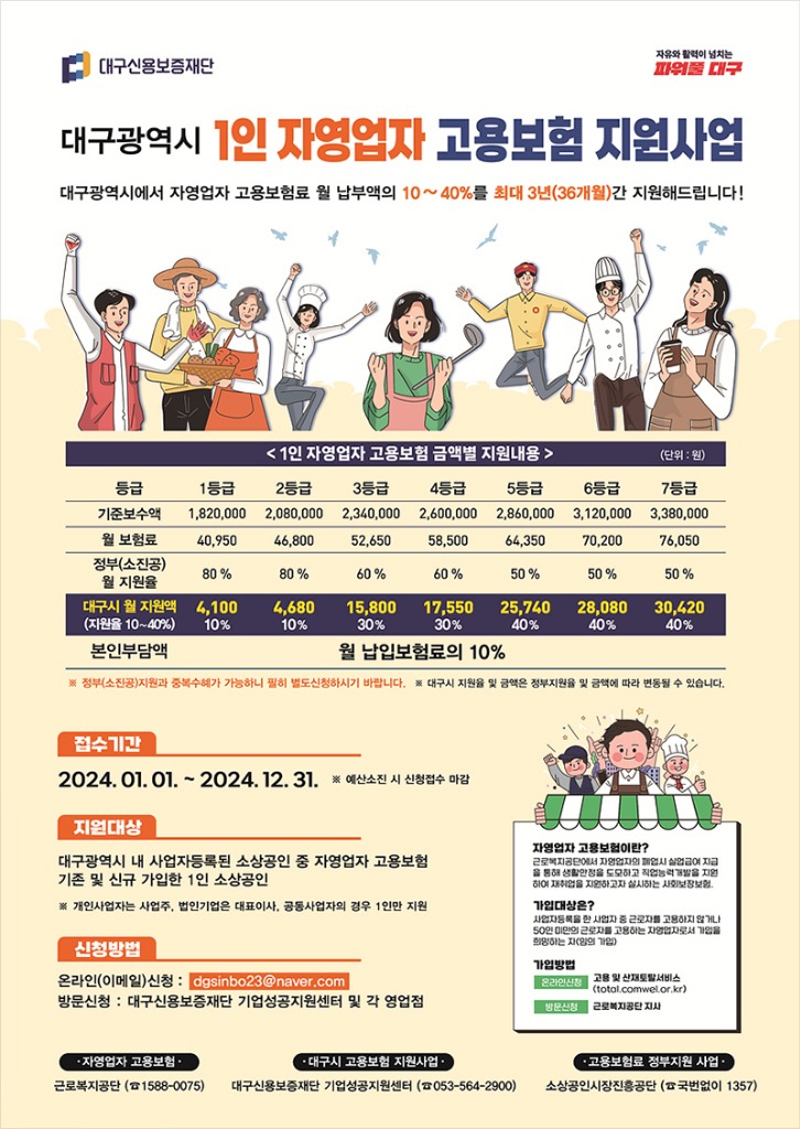 2024년부터 정부와 대구시의 지원이 확대되면서 소상공인은 고용보험료의 10%만 자부담하면 된다. 예를 들어 1인 자영업자가 고용보험 3등급에 가입할 경우 월 보험료가 52,650원이다. 하지만 정부 지원 60%(31,590원), 대구시 지원 30%(15,795원)를 받게 되면 소상공인은 월 보험료 5,265원만 납부하면 된다.