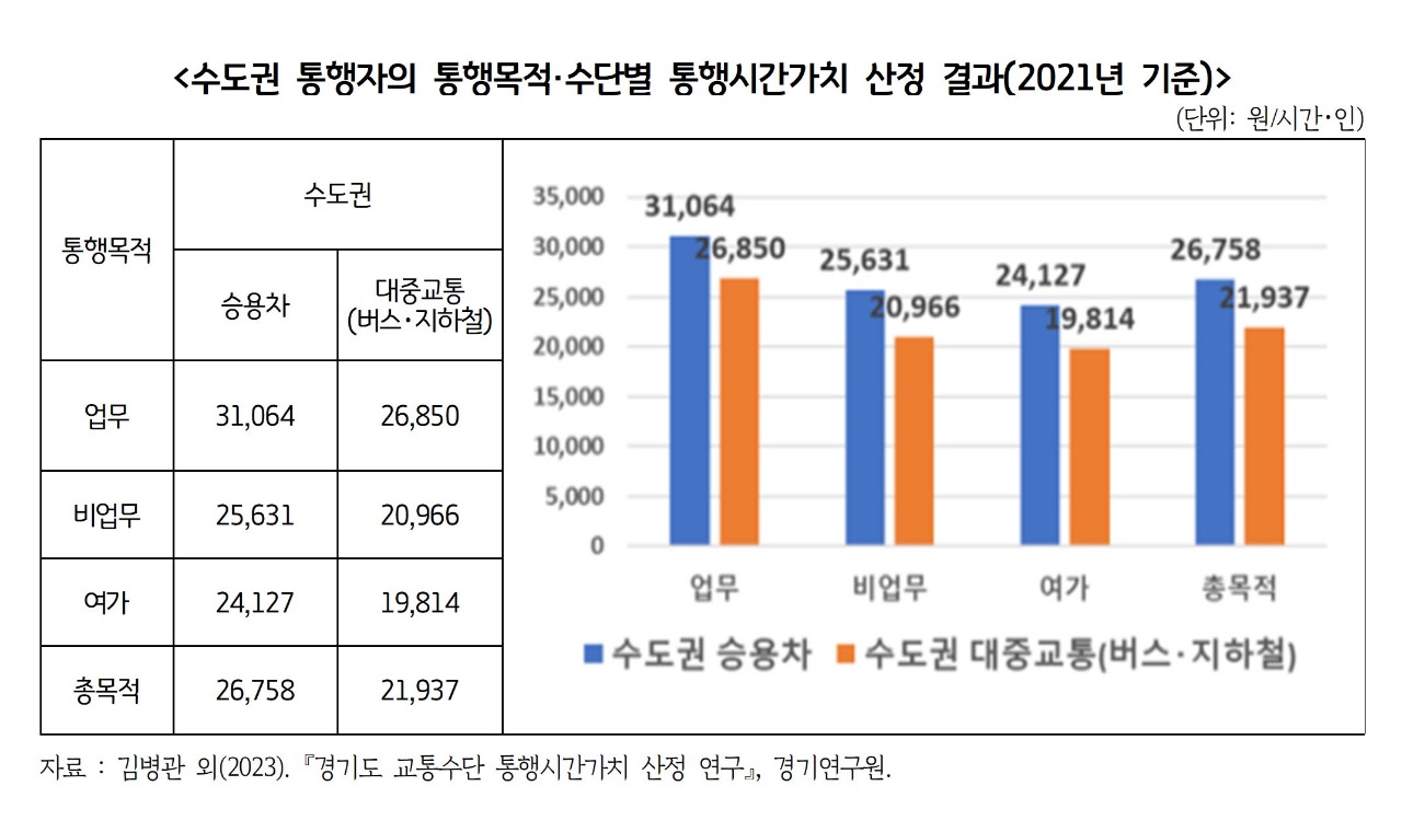 보고서에 따르면 교통정책 결정의 중요한 지표로 활용되고 있는 통행시간가치는 통행자가 1시간의 통행시간을 절감하기 위해서 지불하고자 하는 금전적 가치를 의미하고 있다. 국가 지침에서 제시된 통행시간가치는 전국 지역 간 통행을 기반으로 산정된 결과로 실제 수도권의 통행행태와 통행시간가치를 반영하기에는 한계가 있다는 지적이다. 이는 수도권의 다양한 교통 사회간접자본(SOC) 사업 계획이 타당성 확보에 어려움을 겪고 수도권의 통행 특성과 대중교통 통행의 중요성이 고려되지 못하고 있는 실정으로 나타나고 있다.